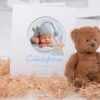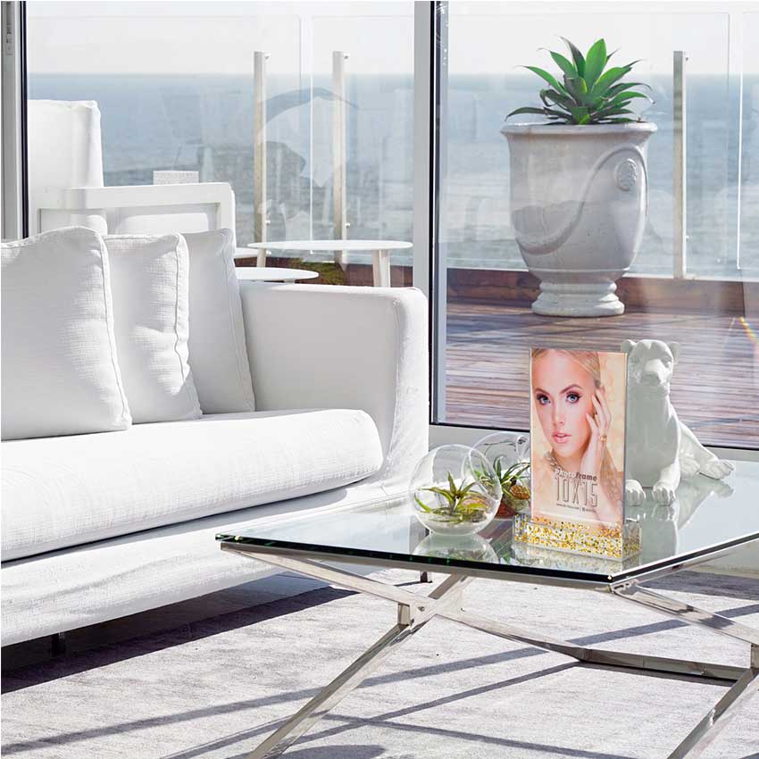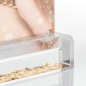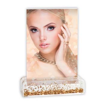 Vodeni ram za slike sa postoljem ispunjenim plutajućim šoljokicama. Ram za fotografije je vertikalno orijentisan. Sjajni stalak za fotografije ima plutajuće zlatne šljokice ili srca unutar svoje osnove, koje se pomeraju i ostaju zakačene kada ga protresete. Ram za fotografije je napravljen od providne akrilne plastike koja čvrsto prekriva fotografiju.